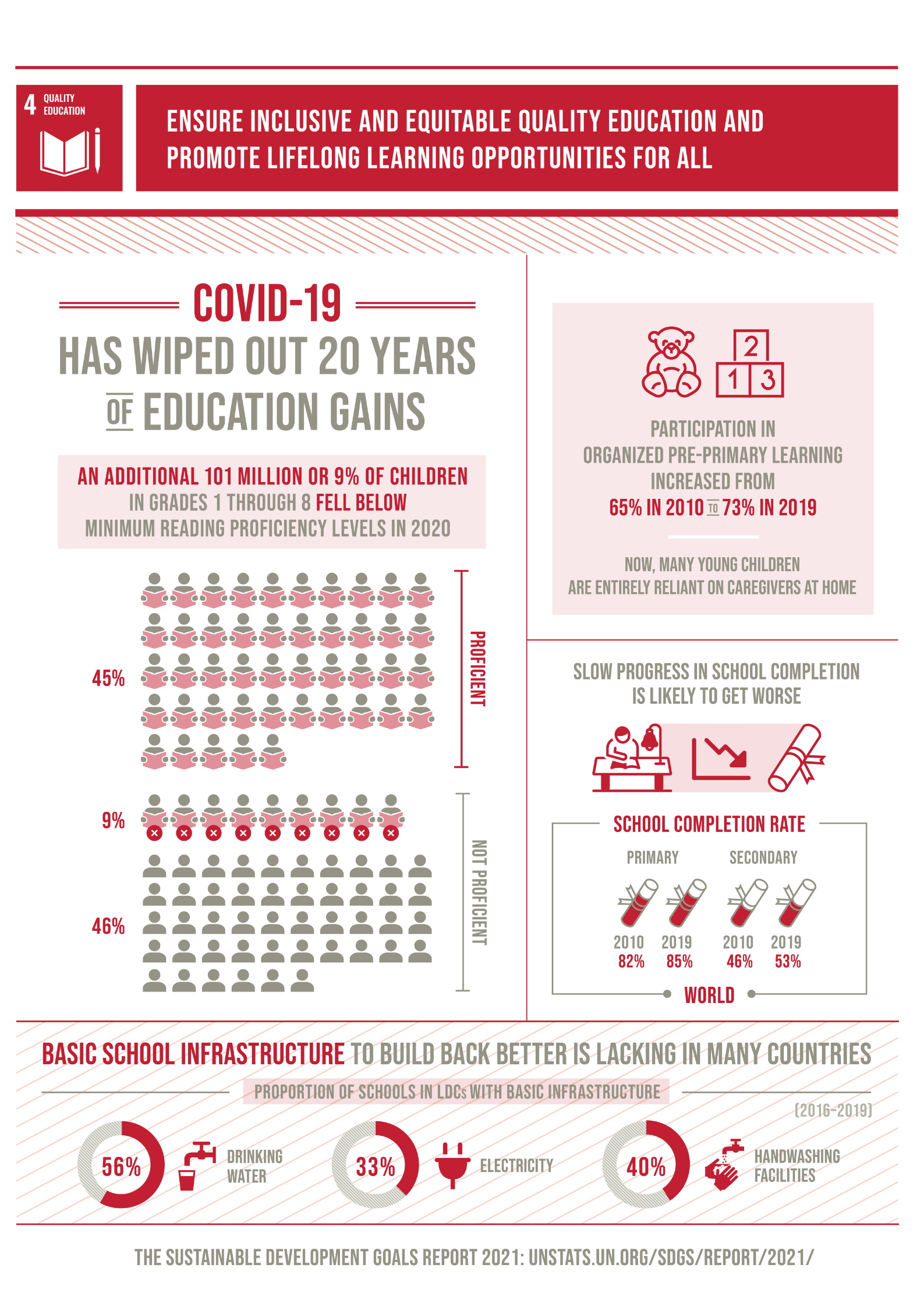 The impact of the COVID-19 pandemic on schooling is a “generational catastrophe”. Before the pandemic, progress was already slow and insufficient to achieve the education targets in the Goals. School closures caused by the pandemic have had devastating consequences for children’s learning and well-being. Hundreds of millions of children and young people are falling behind in their learning, which will have long-term impacts. One year into the COVID-19 crisis, two-thirds of students worldwide are still affected by full or partial school closures. The most vulnerable children and those unable to access remote learning are at increased risk of never returning to school and of being forced into child marriage or child labour.